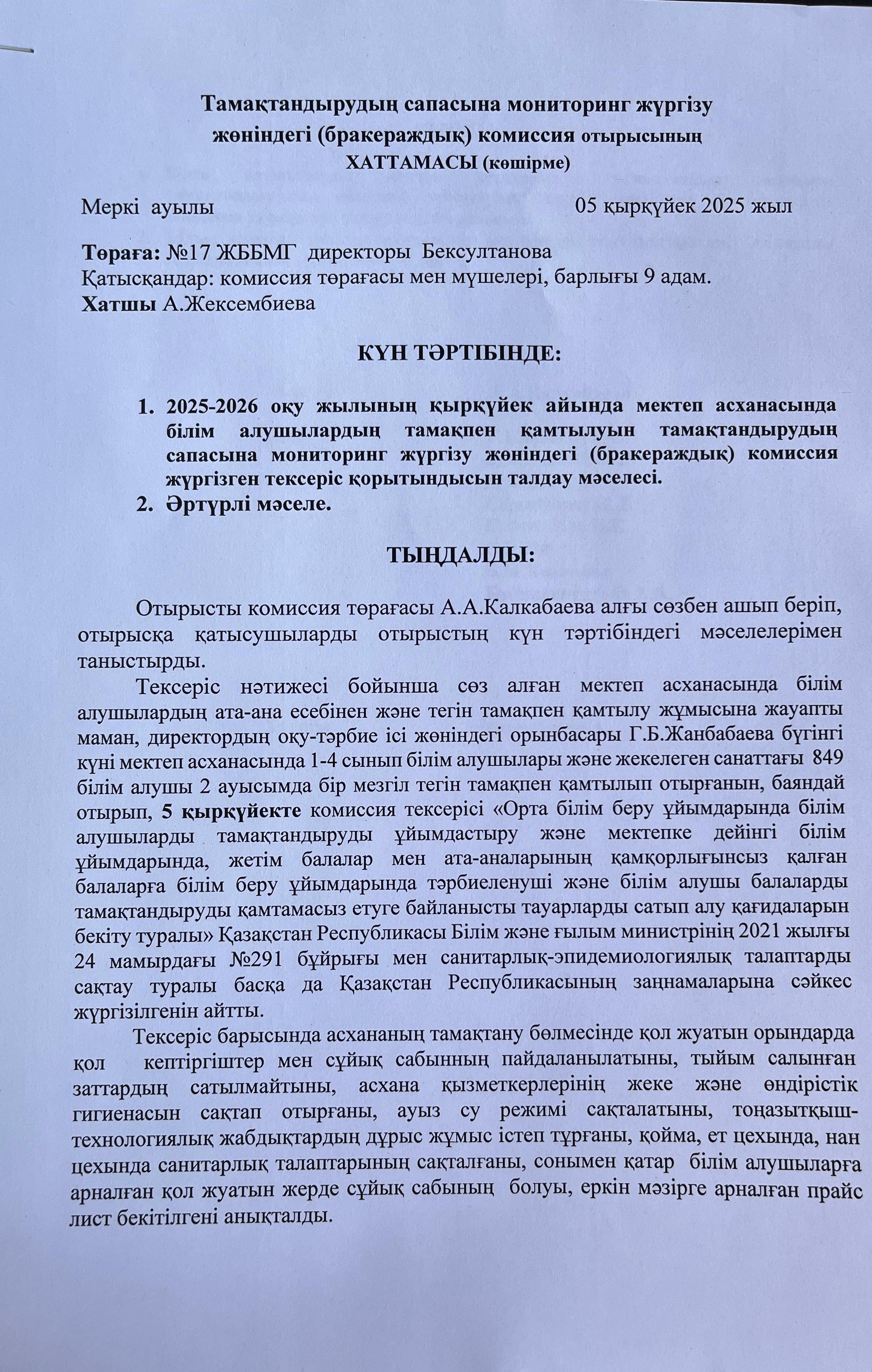 05 сентябрь 2025 0 1 2 3 4 5 Тамақтану сапасына мониторинг жүргізу жөніндегі комиссия отырысының хаттамасы