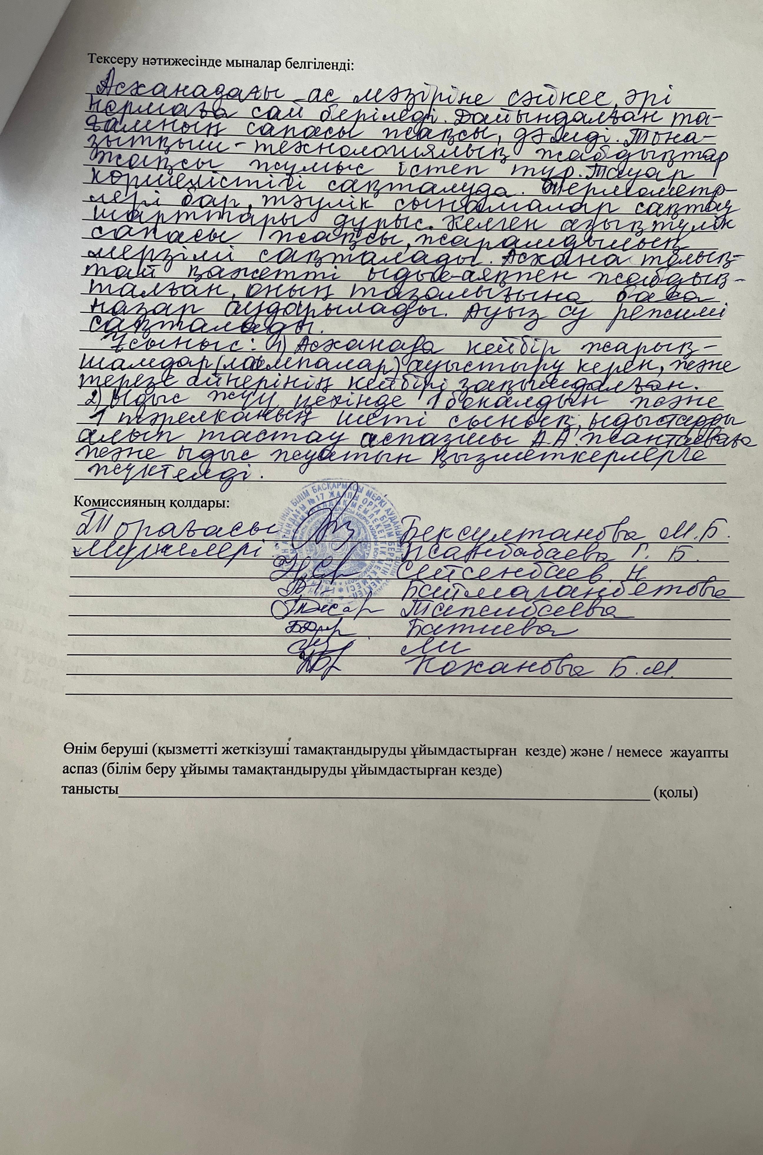 Тамақтану сапасына мониторинг жүргізу актісі № 23 » ОШГ №17 имени Ивана Трубицына