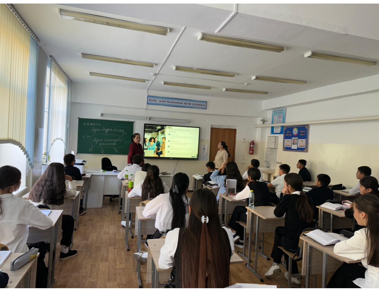 2025 жылдың қыркүйек айында «Мамандықтар әлеміне саяхат» тақырыбында 8 сынып білім алушылармен танымдық сағаты болып өтті. Мақсаты – оқушыларды еңбек әлемімен таныстырып, өз қызығушылығы мен қабілетіне сай болашақ мамандығын саналы түрде таңдауға бағыттау. Мамандықтар туралы түсінік қалыптастыруға, олардың ерекшеліктерін, маңызын және қоғамдағы рөлін танып білуге бағытталған танымдық сағаты. Бұл тақырып аясында оқушылар әртүрлі кәсіп иелерімен танысып, олардың қызметі, атқаратын міндеттері мен қажетті дағдылары туралы мағлұмат алды. Сонымен қатар, заманауи жаңа мамандықтар мен еңбек нарығындағы өзгерістер туралы да ақпарат алады.