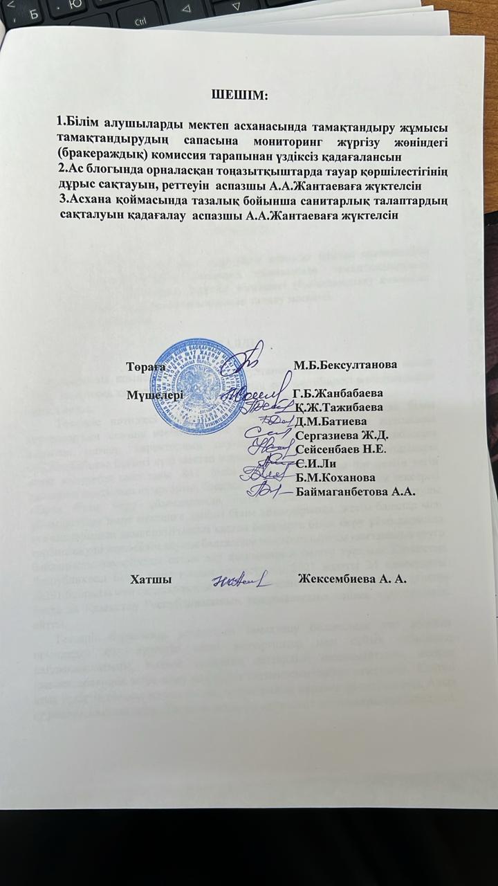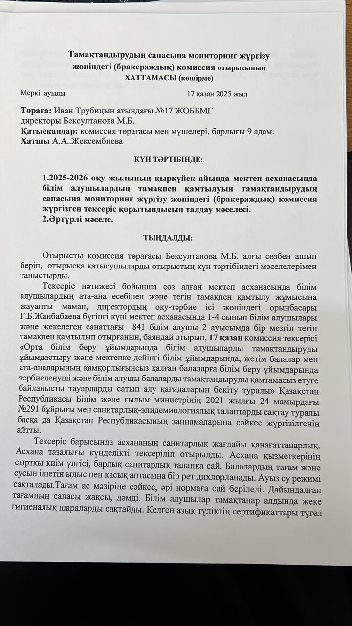 17 октябрь 2025 0 1 2 3 4 5 Тамақтану сапасына мониторинг жүргізу жөніндегі комиссия отырысының хаттамасы