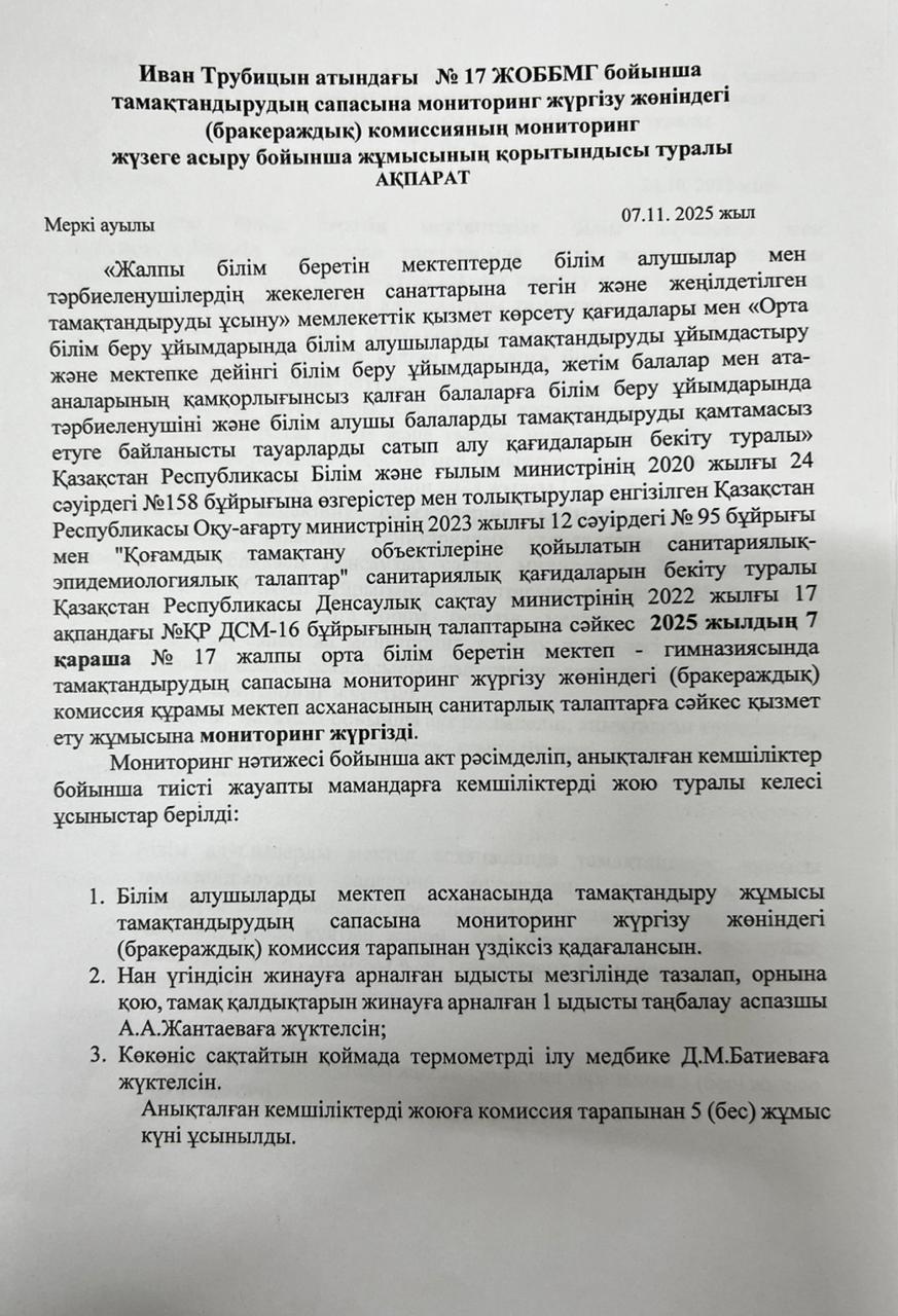 Тамақтану сапасына мониторинг жүргізу қорытындысы туралы АҚПАРАТ » ОШГ №17 имени Ивана Трубицына