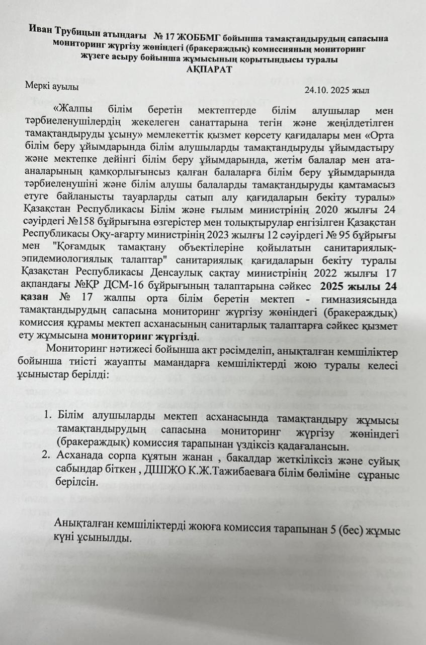 Тамақтану сапасына мониторинг жүргізу қорытындысы туралы АҚПАРАТ » ОШГ №17 имени Ивана Трубицына