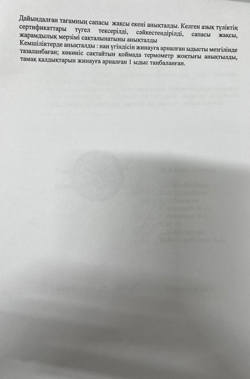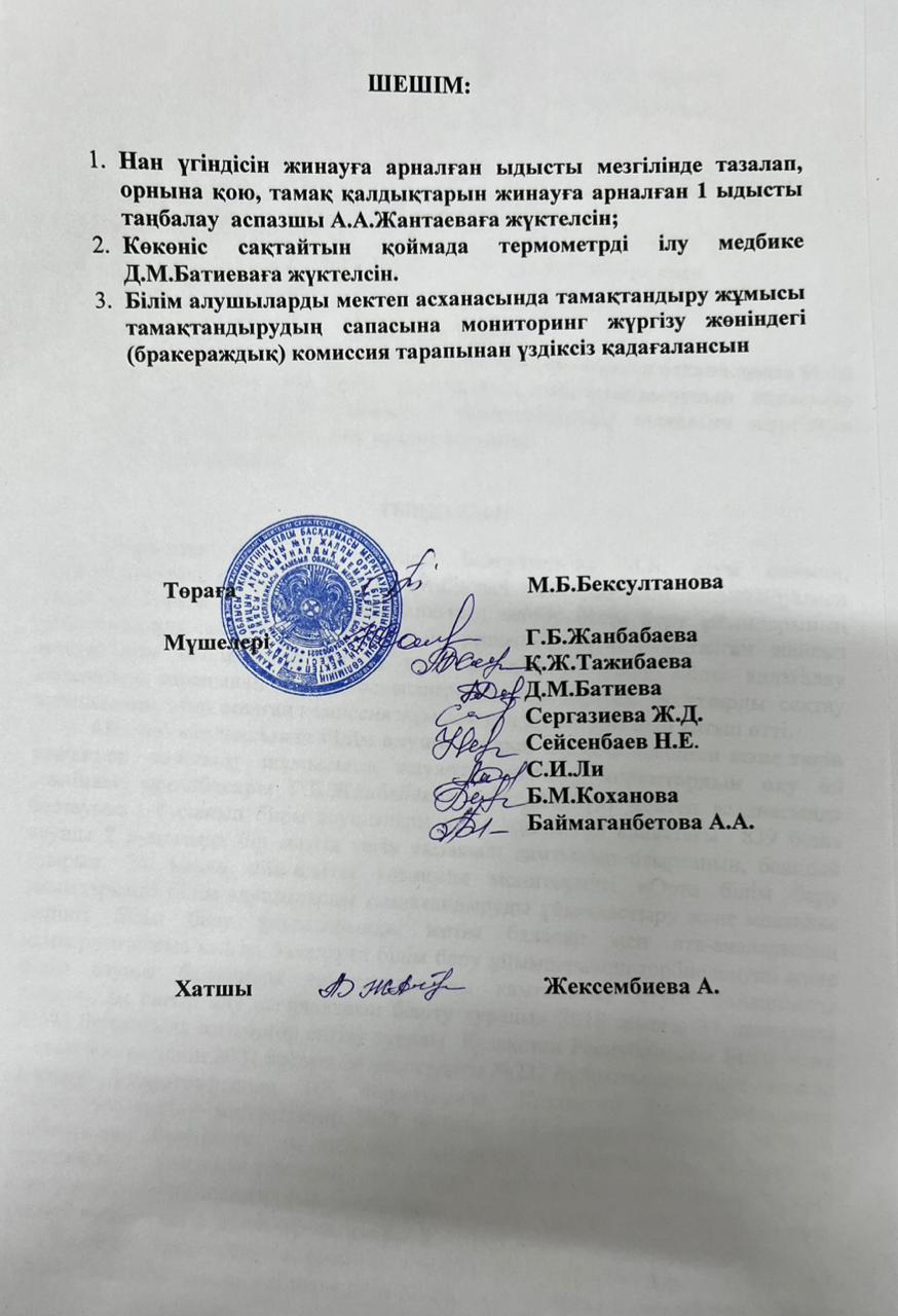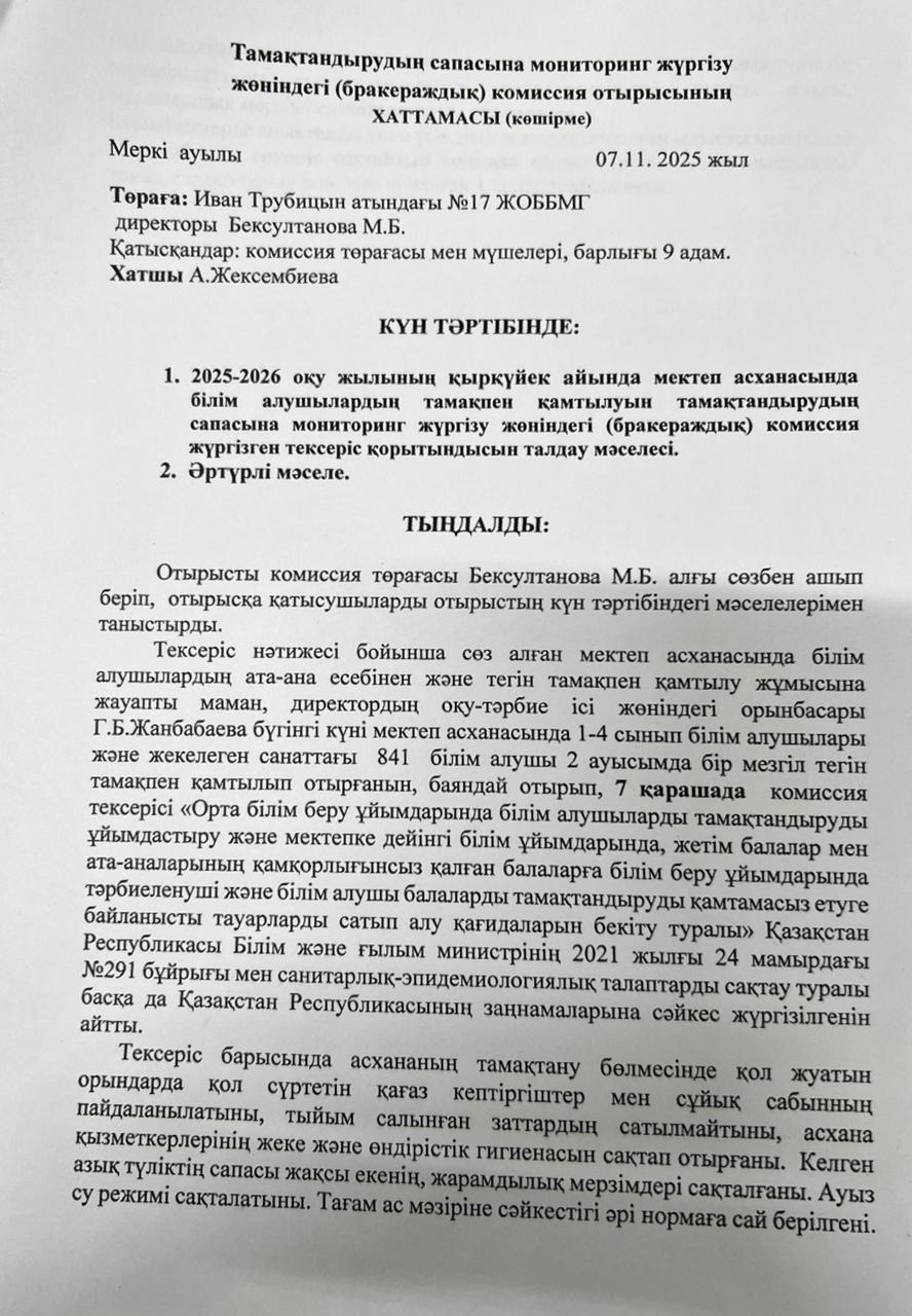 07 ноябрь 2025 0 1 2 3 4 5 Тамақтану сапасына мониторинг жүргізу жөніндегі комиссия отырысының хаттамасы