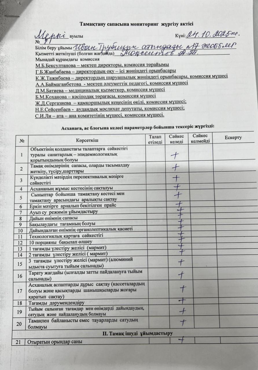 Тамақтану сапасына мониторинг жүргізу актісі № 29