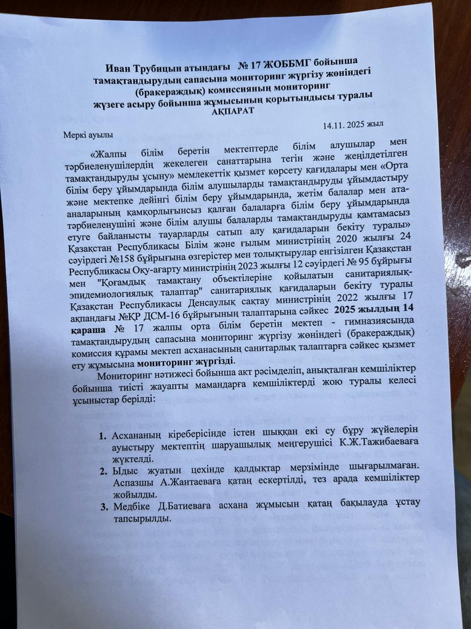 Тамақтану сапасына мониторинг жүргізу қорытындысы туралы АҚПАРАТ » ОШГ №17 имени Ивана Трубицына