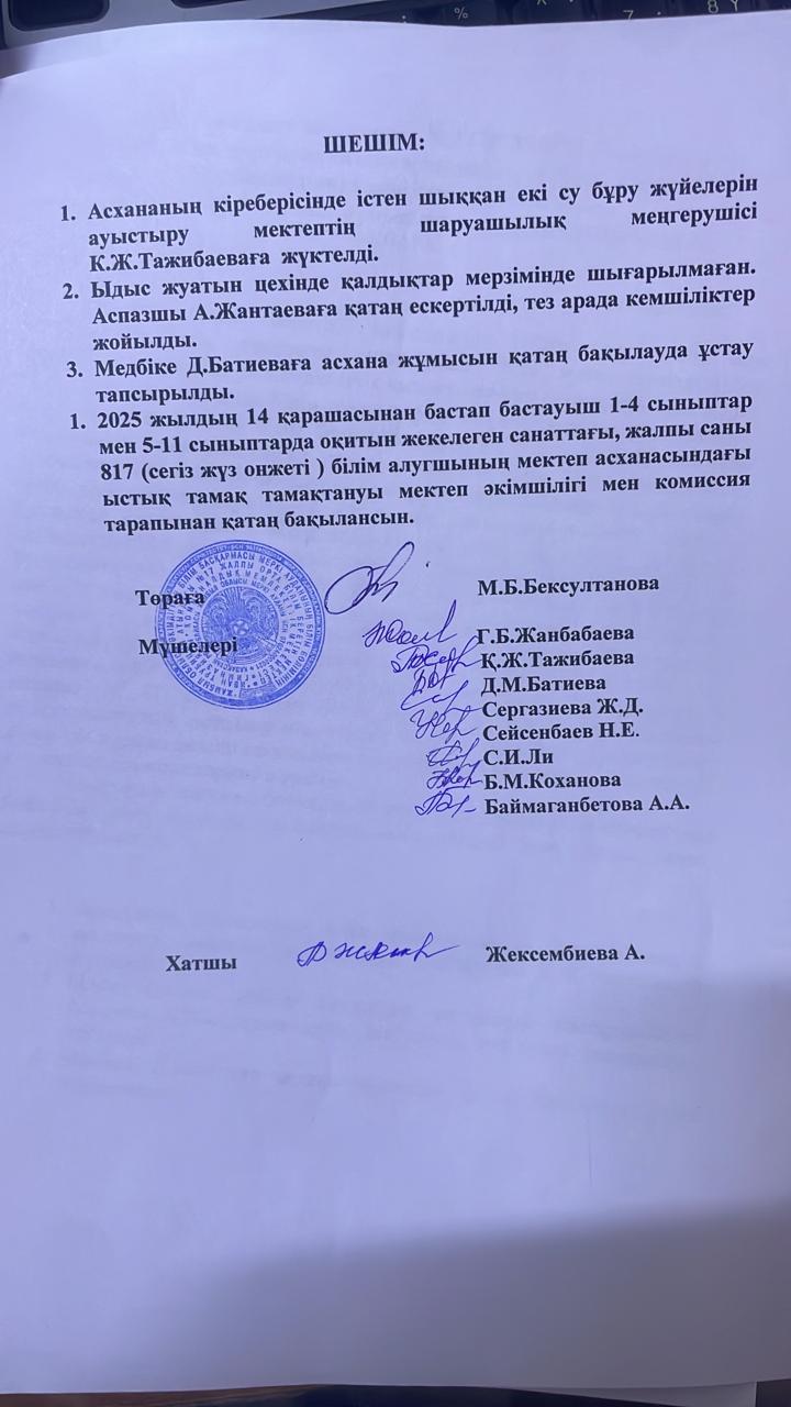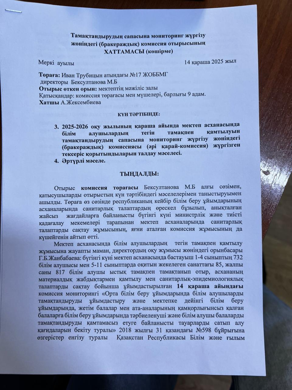 14 ноябрь 2025 0 1 2 3 4 5 Тамақтану сапасына мониторинг жүргізу жөніндегі комиссия отырысының хаттамасы