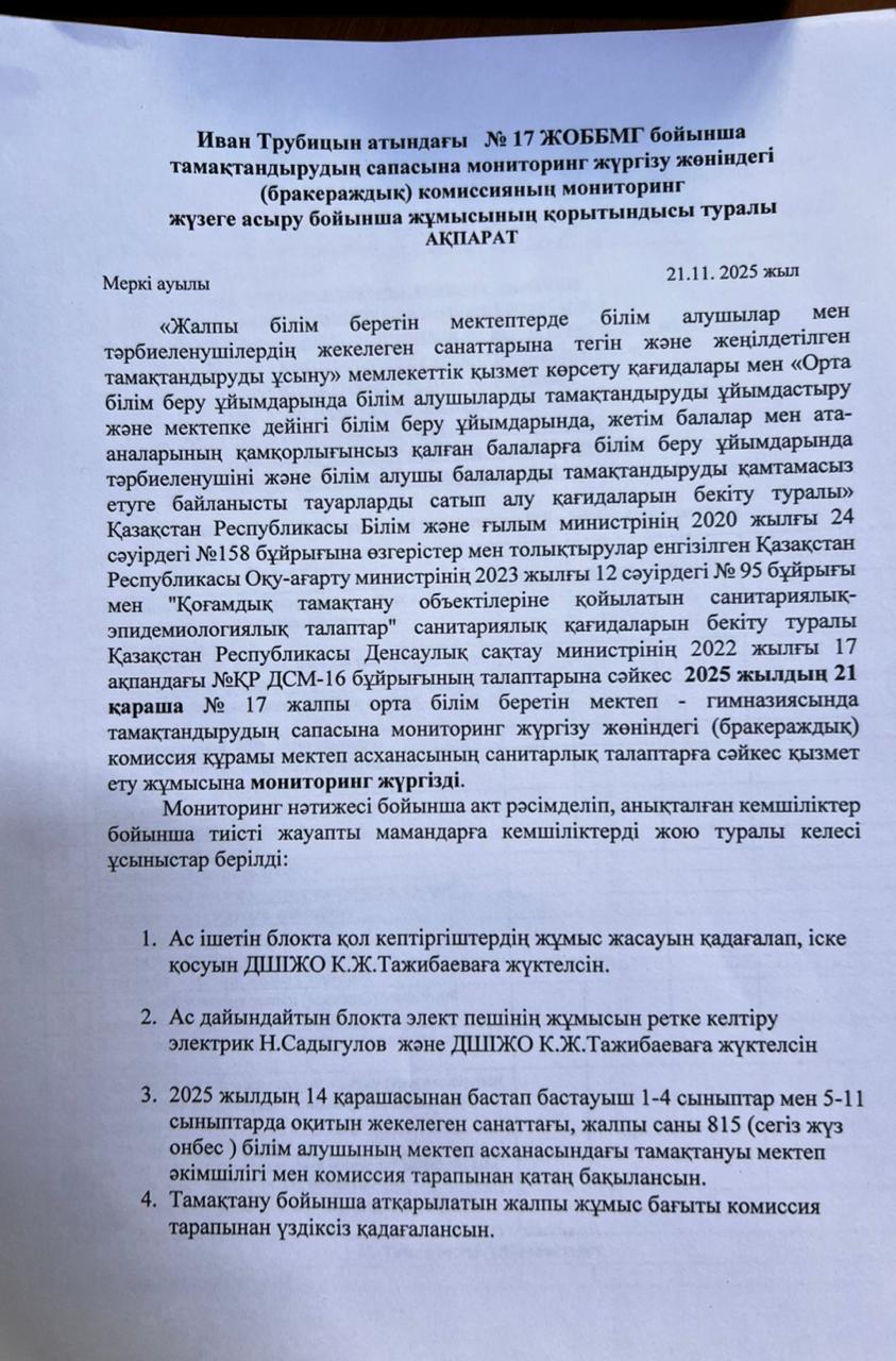 Тамақтану сапасына мониторинг жүргізу қорытындысы туралы АҚПАРАТ » ОШГ №17 имени Ивана Трубицына